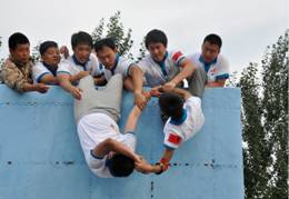 本次拓展训练的最后一个项目是翻越毕业墙,全体学员打破了连队间的束缚,分成了两支队伍,凝聚成两个整体,所有学员们忘记了国籍的不同,性别的差异,克服重重困难,纷纷表现出甘当人梯的精神,齐心协力、共同进退,最终两支队伍均少于预计时间征服了毕业墙,这种成功的喜悦有的化作泪水,有的化作微笑,绽放在每一名队员的脸上。